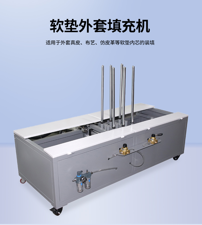 1.軟墊外套填充機適用于大型軟墊外套真皮、布藝、仿皮革等軟墊內(nèi)芯的裝填, 針對于人工套袋費時費力而且套袋效果不平整的情況下,這款機器解決了以上難點。