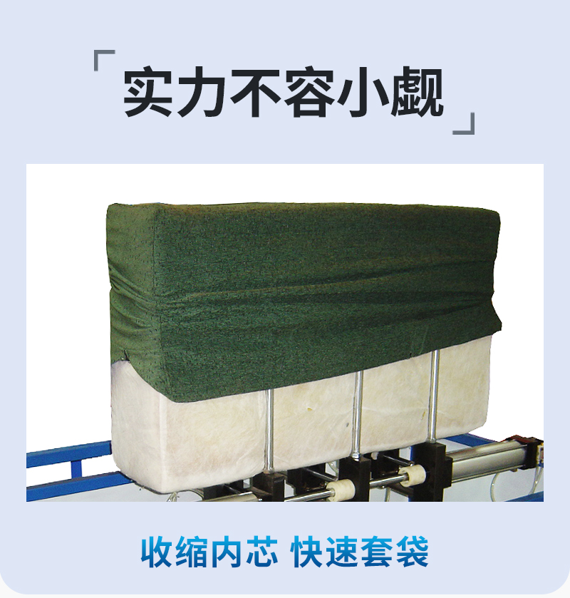 2.整機操作簡單便捷,操作步驟: 放置大軟墊,收縮夾桿夾緊軟墊,套袋,氣缸頂出完整套袋。