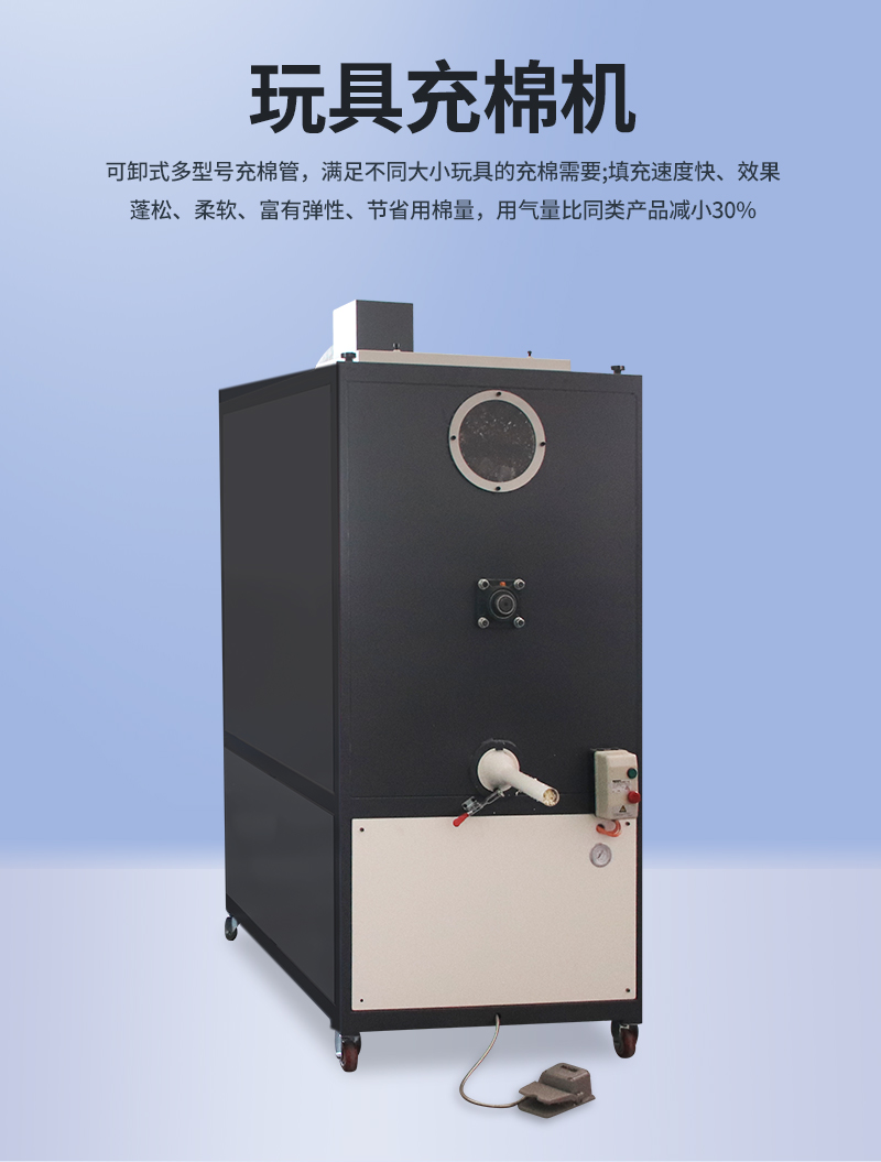 1.本機采用電子腳踏微動開關(guān),可靠的控制技術(shù)使機器對玩具充棉花收放自如,精確控制噴棉量。