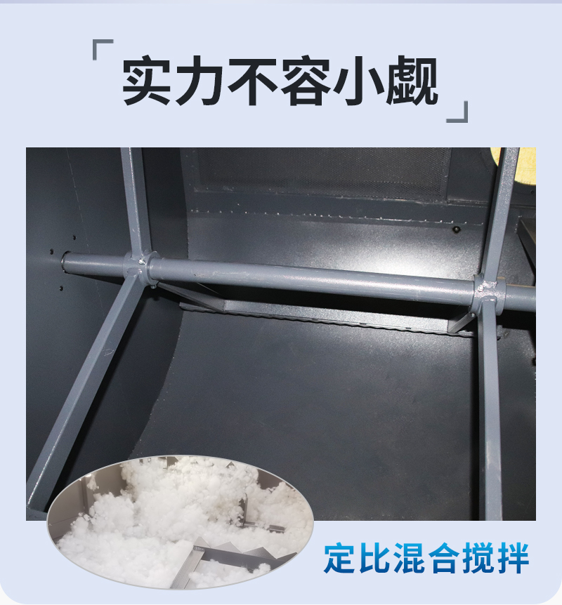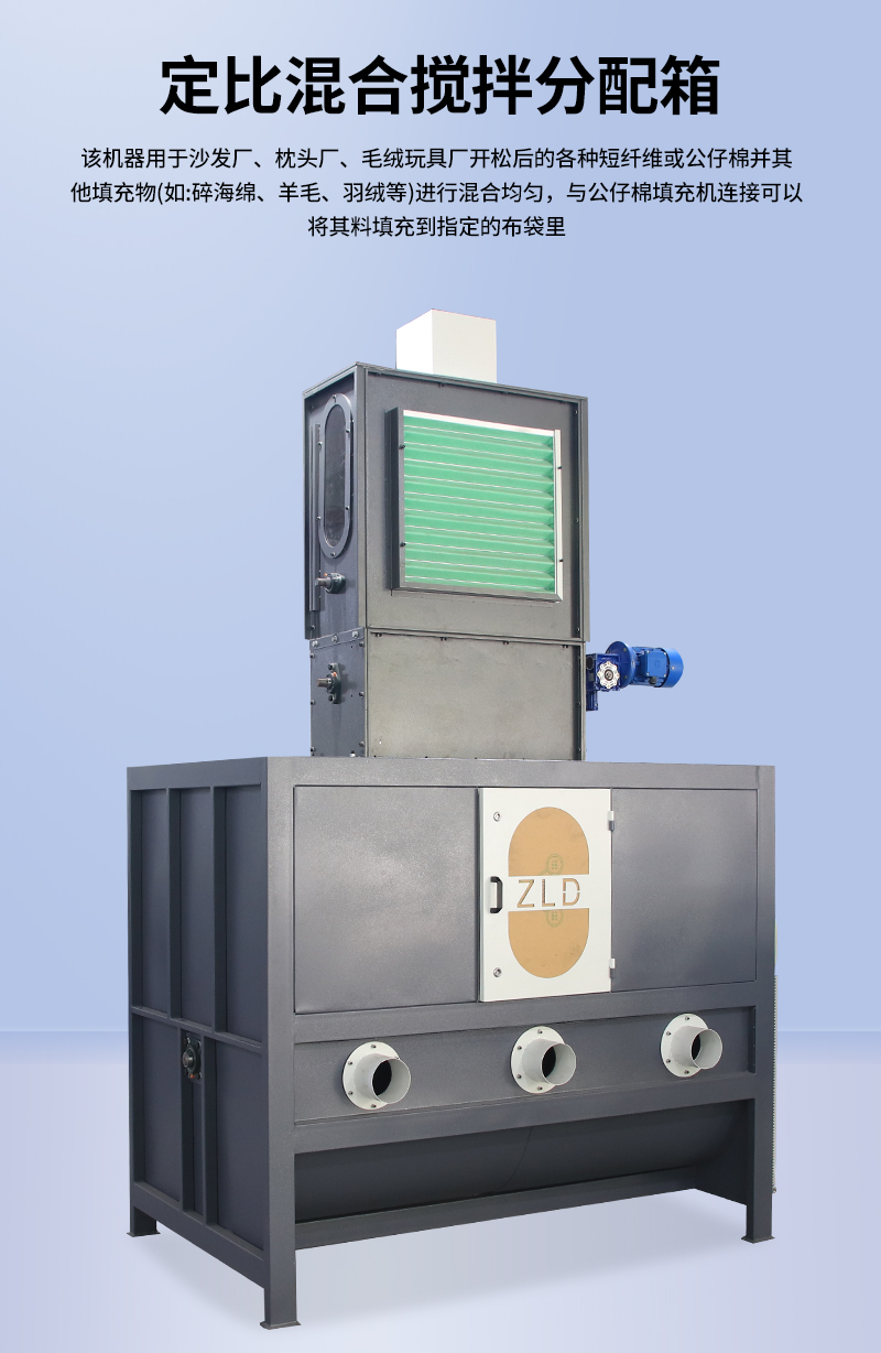 1.簡易定比混合攪拌箱適用于沙發(fā)廠、枕頭廠、毛絨玩具廠開松后的各種短纖維或公仔棉并其他填充物(如碎海綿、羊毛、羽絨等)進行混合均勻。